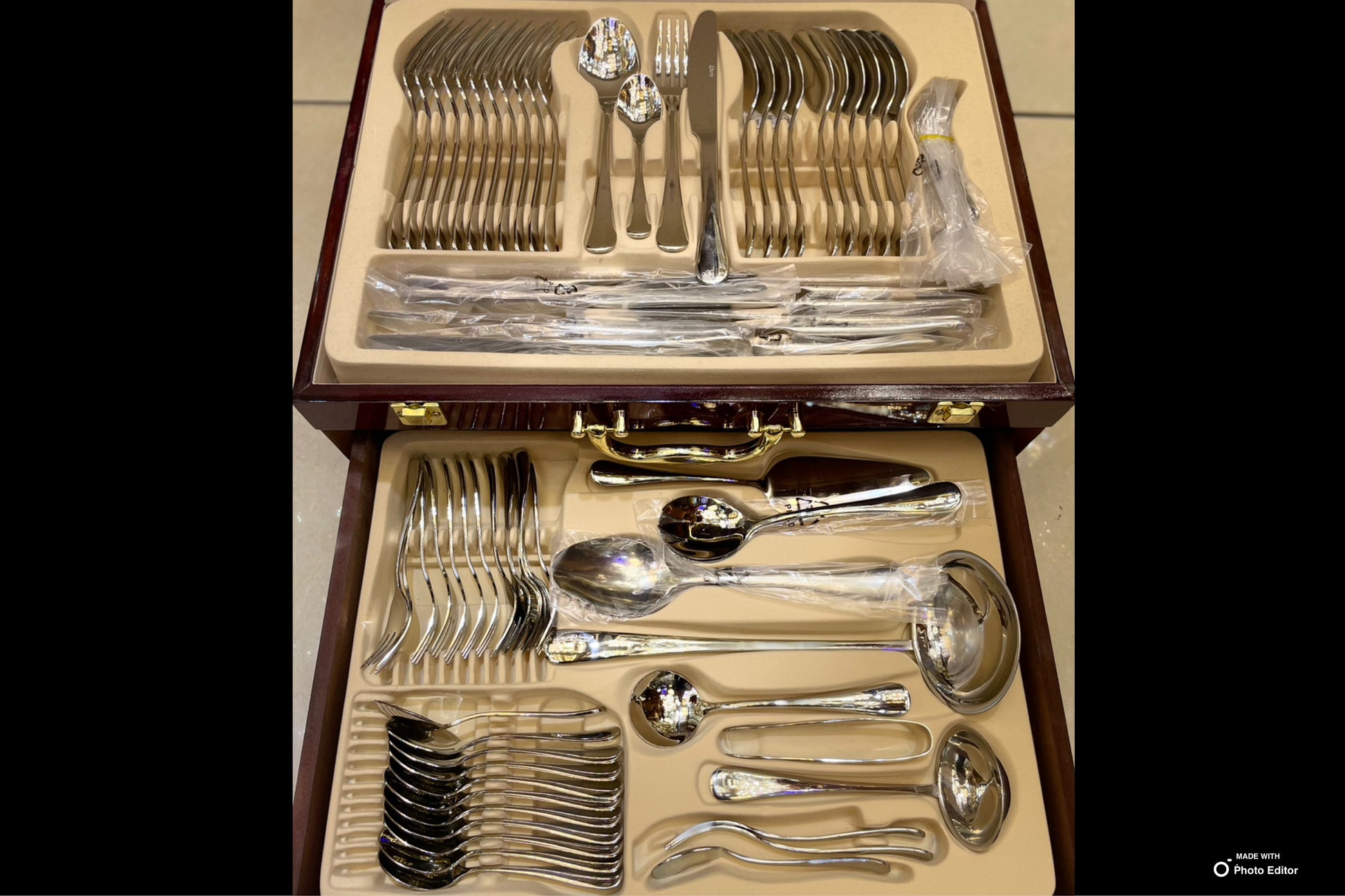 Upgrade your dining elegance with the 84-Piece Cutlery Set in matte finish, beautifully encased in a wooden box. This premium stainless steel set is dishwasher-safe and includes: